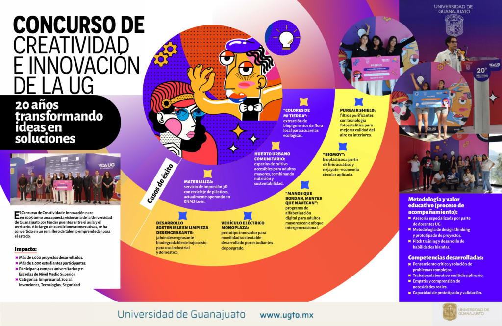 Desde hace dos décadas, la Universidad de Guanajuato impulsa la creatividad y la innovación a través del Concurso de Creatividad e Innovación, que se ha consolidado como un espacio estratégico para unir el conocimiento académico con los retos reales del entorno, promoviendo soluciones viables, sostenibles y con impacto.