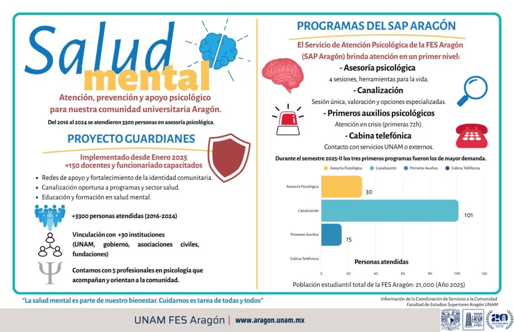 Con el objetivo de atender, prevenir y acompañar a la comunidad universitaria en temas de salud mental, la Facultad de Estudios Superiores (FES) Aragón impulsa el trabajo del Servicio de Atención Psicológica (SAP Aragón), que ha brindado apoyo a más de 3 mil 300 personas entre 2016 y 2024.