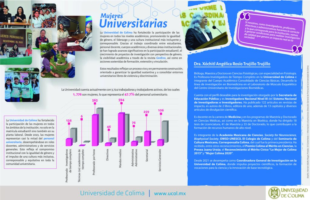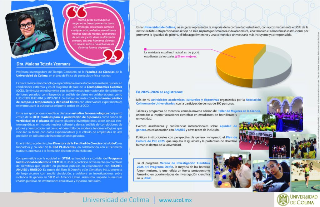 Compartimos, además, el perfil de dos académicas cuyas trayectorias ilustran la contribución de las mujeres al conocimiento científico y al fortalecimiento de la educación superior: la investigadora Xóchitl Angélica Rosío Trujillo Trujillo, especialista en ciencias fisiológicas y actual coordinadora general de Investigación de la Universidad de Colima, y la física Malena Tejeda Yeomans, reconocida por su trabajo en física de partículas y su impulso a la formación de nuevas vocaciones científicas.