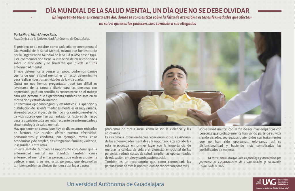 En el Día Mundial de la Salud Mental, que se celebra cada 10 de octubre, es propicio destacar la importancia de concientizar sobre estas enfermedades y la atención oportuna, con el propósito de mejorar la calidad de vida y el bienestar emocional de las personas, reducir costos de salud, ampliar las oportunidades de educación, empleo y participación social.