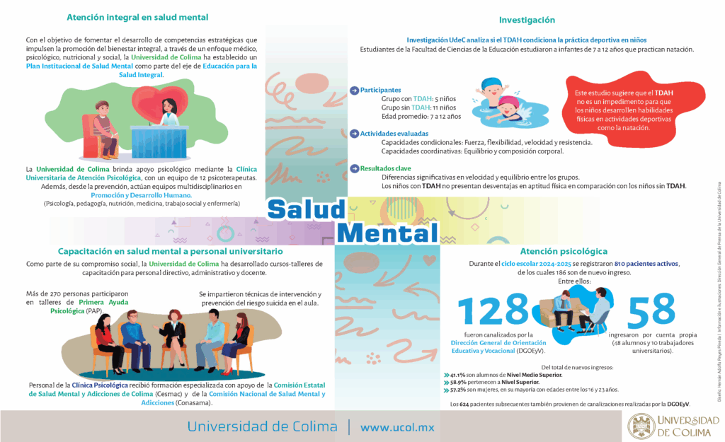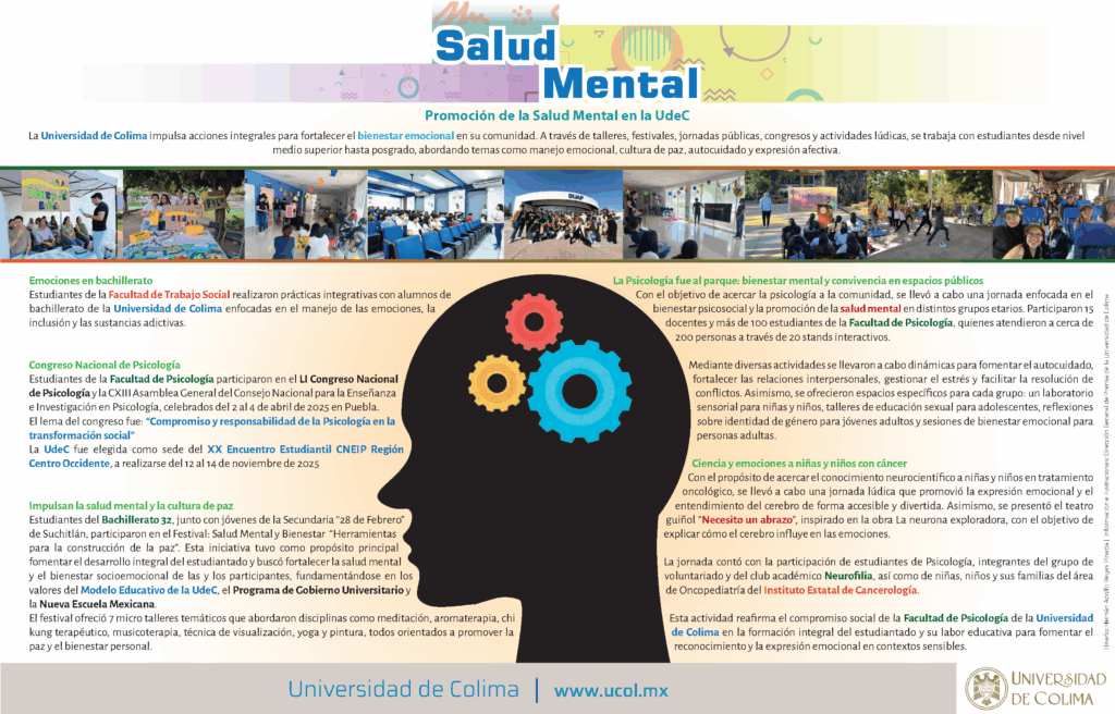 En la Universidad de Colima se renovó la Dirección General para el Desarrollo Integral (DGDI), agrupándose el eje de salud mental con el de Educación para la Salud Integral, a través del cual se está elaborando el Plan Institucional de Salud Mental. Con el trabajo conjunto de la Clínica Universitaria de Atención Psicológica (CUAP), las Unidades de Salud Integral (USI) –con presencia en los campus universitarios–, y el personal de la DGDI, se busca fomentar el desarrollo de competencias estratégicas para favorecer la promoción de la salud integral a través de un enfoque médico, psicológico, nutricional y social en la comunidad universitaria.