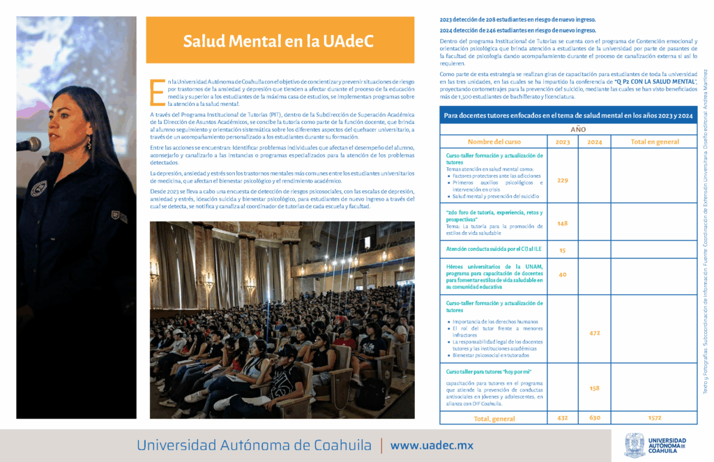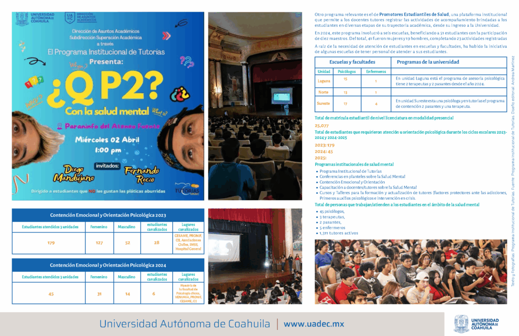 La Universidad Autónoma de Coahuila ha colocado a la salud mental como un eje fundamental en la formación integral de su comunidad universitaria. A través de programas de acompañamiento, asesoría psicológica y actividades de prevención, la institución ha impulsado un modelo de atención cercano, accesible y sensible a las necesidades de estudiantes, docentes y personal administrativo. Esta labor refleja su compromiso con la construcción de entornos educativos saludables que fortalezcan tanto el bienestar emocional como el desarrollo académico.