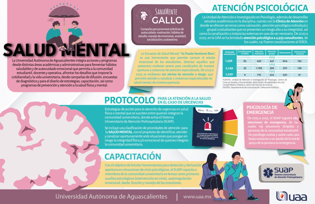 En lo que va del año 2025, la UAA a través de su Clínica de Atención Psicológica se ha brindando atención a 1,230 consultantes. A lo largo del año se realizan campañas de difusión para fomentar el autocuidado emocional, así como de los servicios de la Unidad de Atención e Investigación en Psicología de la UAA. Como un deber colectivo, estudiantes apoyan mediante charlas y proyectos de servicio social y prácticas profesionales para aumentar la difusión de temas clave como la salud mental y el manejo emocional.