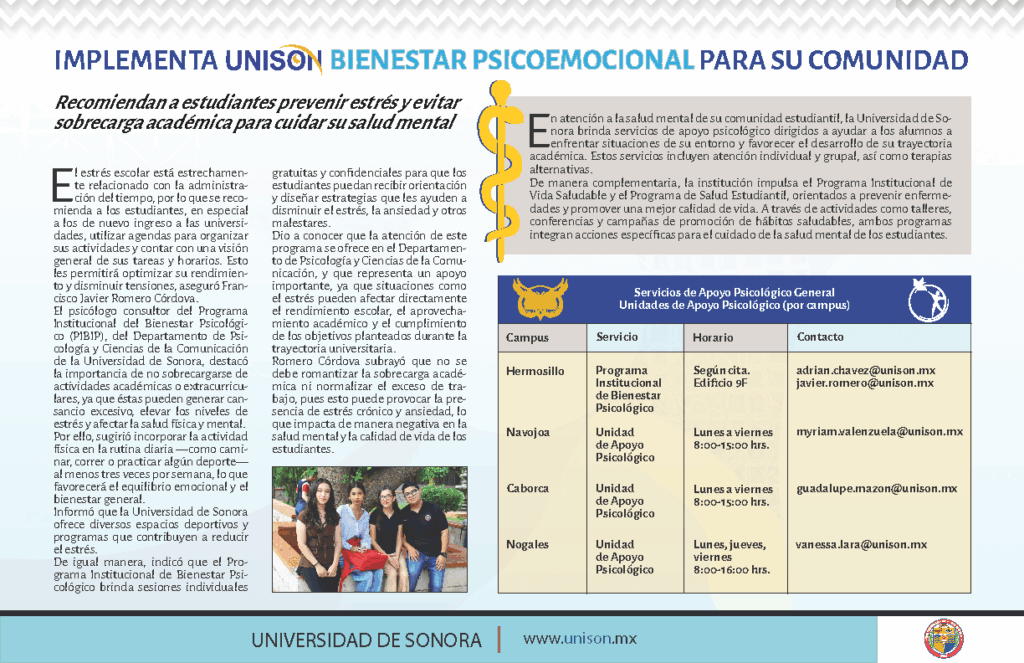 De manera complementaria, la institución cuenta con Unidades de Apoyo Psicológico en distintos campus (Hermosillo, Navojoa, Caborca y Nogales), donde los estudiantes pueden acceder a orientación profesional y sesiones individuales gratuitas y confidenciales. Estos espacios ofrecen acompañamiento para el manejo del estrés, la ansiedad y otros retos emocionales propios de la vida universitaria.